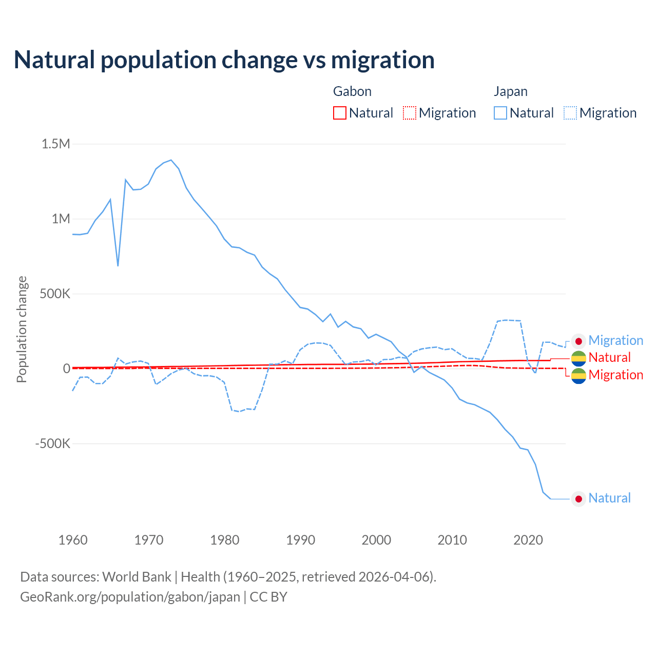 Over the last 10 years, 91.1% of the population change in Gabon is from natural causes (a gain of 515,484 people) and 8.86% is from migration (a gain of 50,119 people). In Japan 73.6% is from natural causes (a loss of 5,178,838 people) and 26.4% is from migration (a gain of 1,860,103 people).