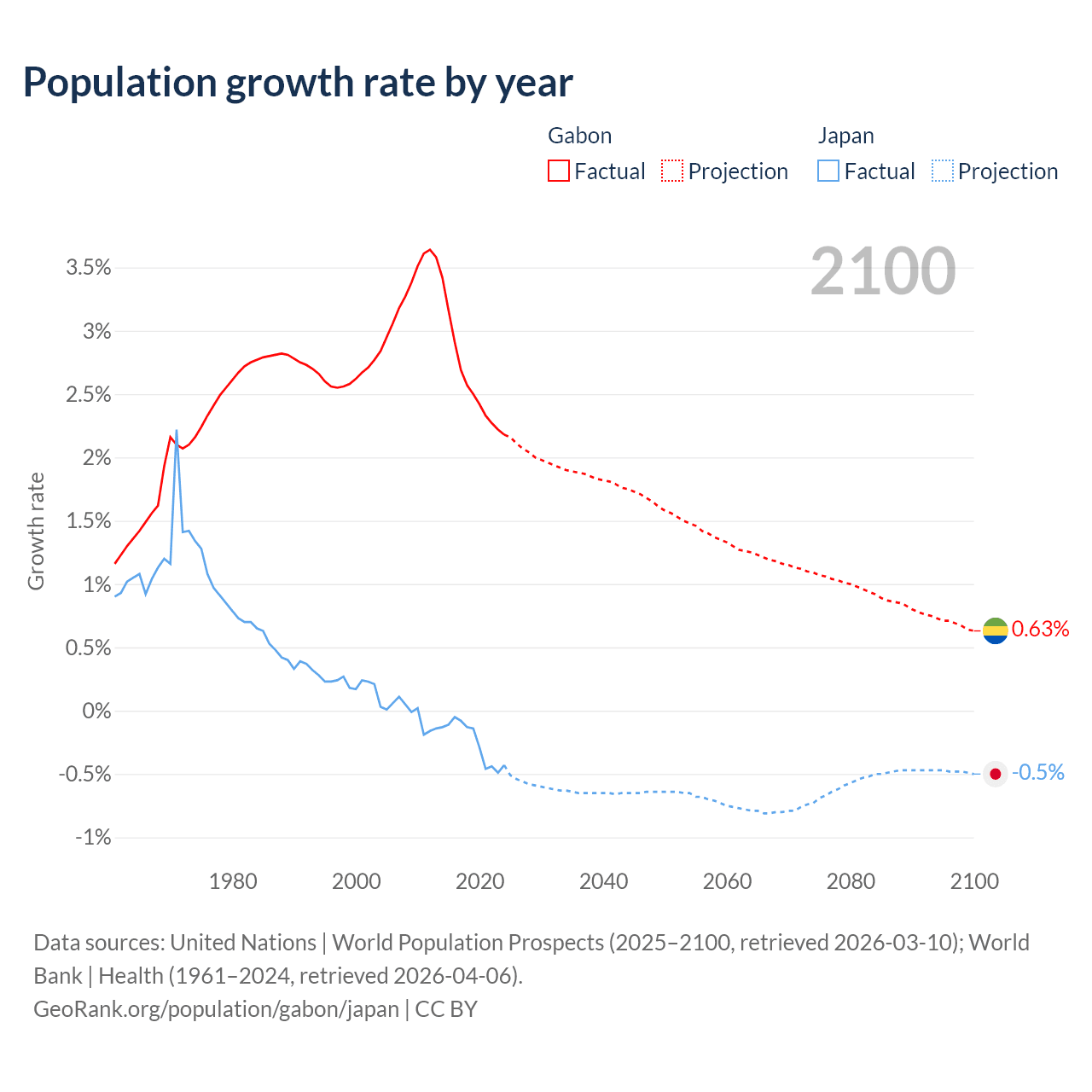 - For the last 10 years, Gabon has had an average growth rate of +2.61% per year vs -0.25% in Japan.