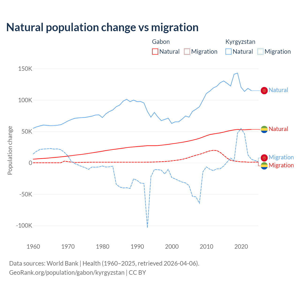 Over the last 10 years, 91.1% of the population change in Gabon is from natural causes (a gain of 515,484 people) and 8.86% is from migration (a gain of 50,119 people). In Kyrgyzstan 88.5% is from natural causes (a gain of 1,258,837 people) and 11.5% is from migration (a gain of 164,132 people).