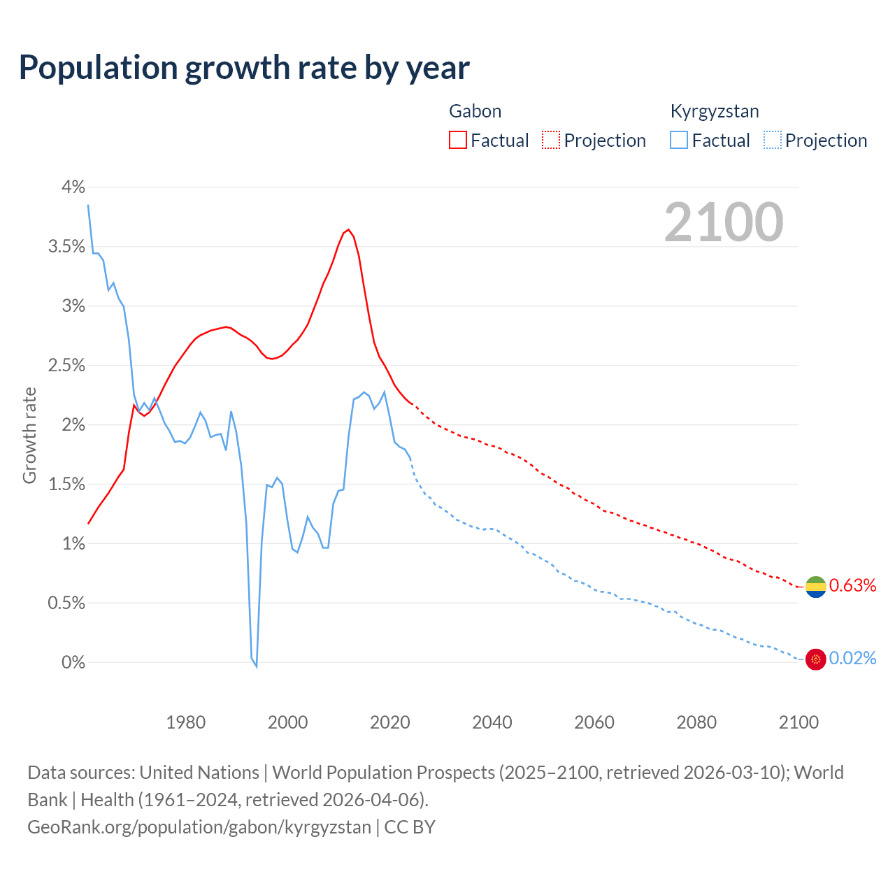 - For the last 10 years, Gabon has had an average growth rate of +2.61% per year vs +2.05% in Kyrgyzstan.