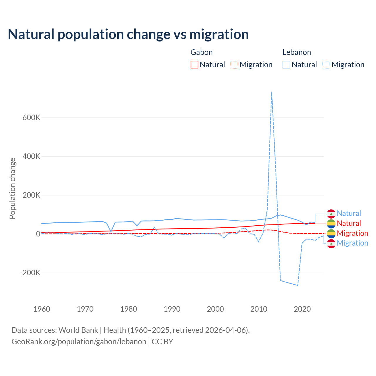 Over the last 10 years, 91.1% of the population change in Gabon is from natural causes (a gain of 515,484 people) and 8.86% is from migration (a gain of 50,119 people). In Lebanon 40.1% is from natural causes (a gain of 739,256 people) and 59.9% is from migration (a loss of 1,103,772 people).