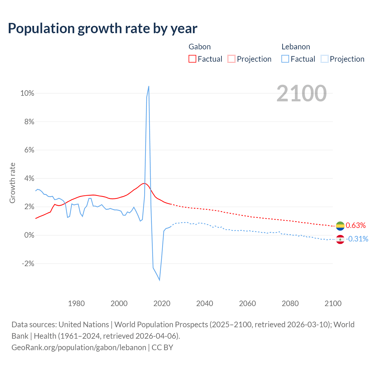 - For the last 10 years, Gabon has had an average growth rate of +2.61% per year vs +0.16% in Lebanon.