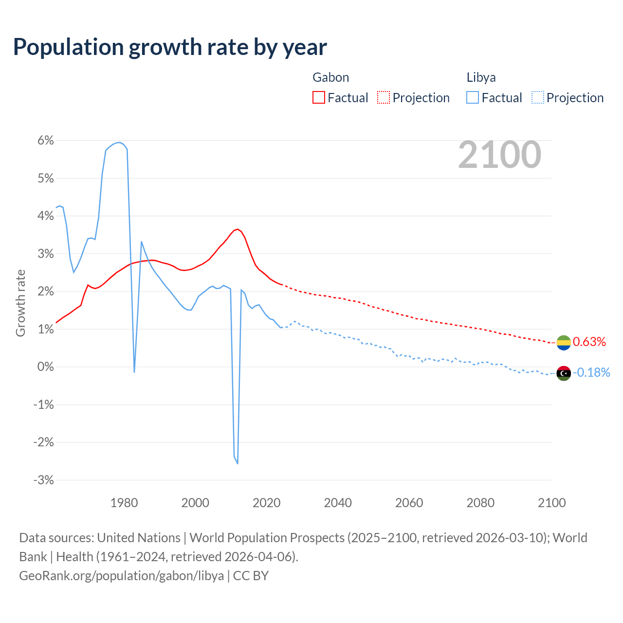 - For the last 10 years, Gabon has had an average growth rate of +2.61% per year vs +1.44% in Libya.