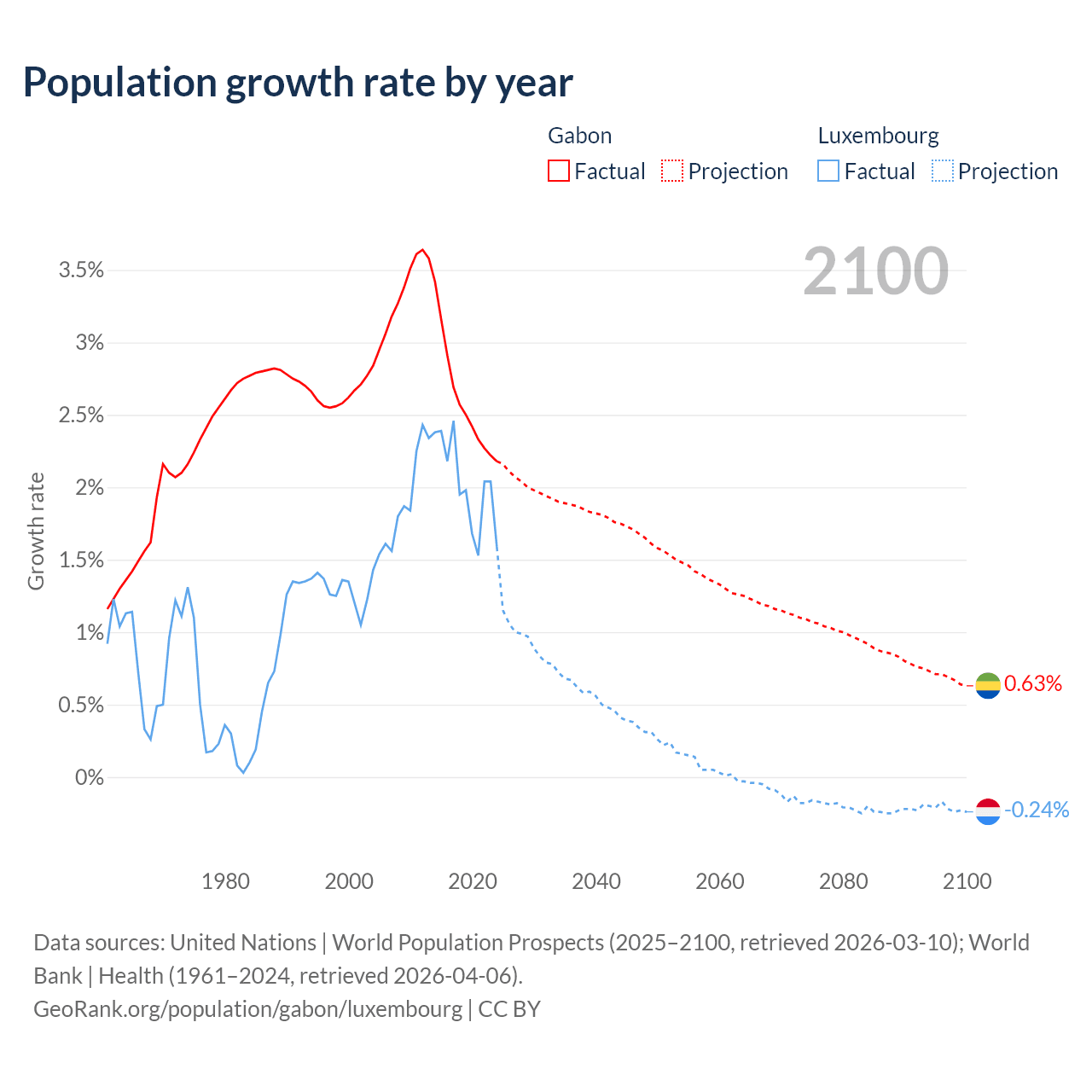 - For the last 10 years, Gabon has had an average growth rate of +2.61% per year vs +2.02% in Luxembourg.
