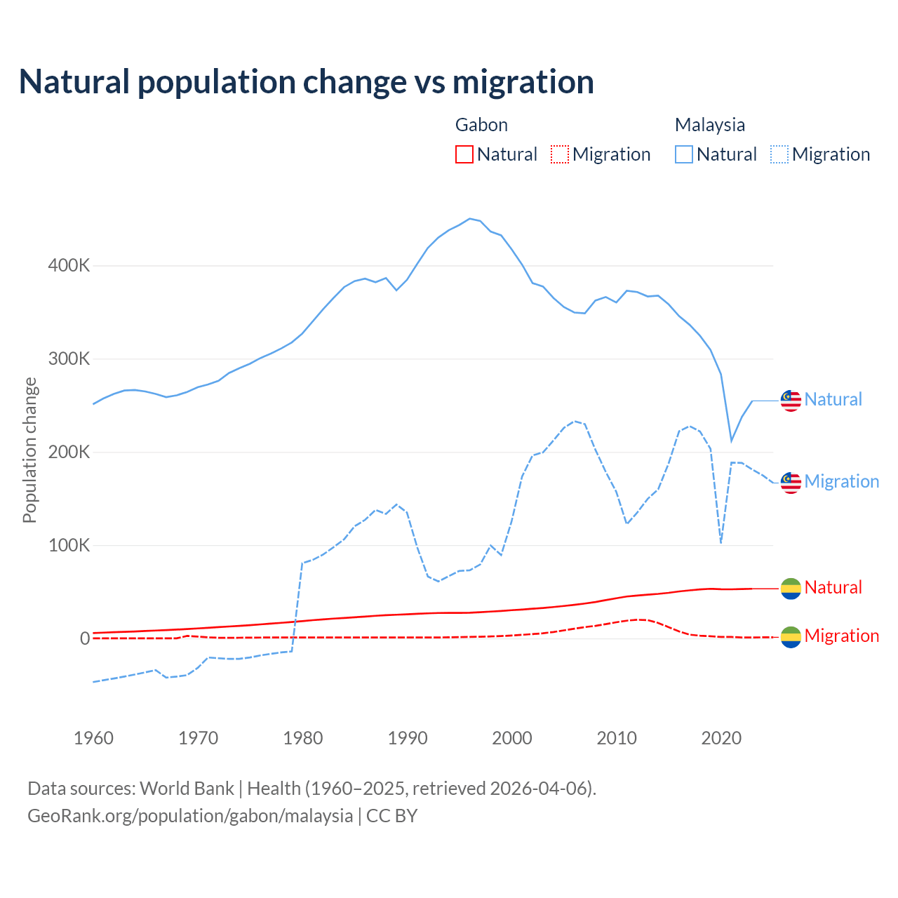 Over the last 10 years, 91.1% of the population change in Gabon is from natural causes (a gain of 515,484 people) and 8.86% is from migration (a gain of 50,119 people). In Malaysia 61.7% is from natural causes (a gain of 3,029,648 people) and 38.3% is from migration (a gain of 1,882,159 people).