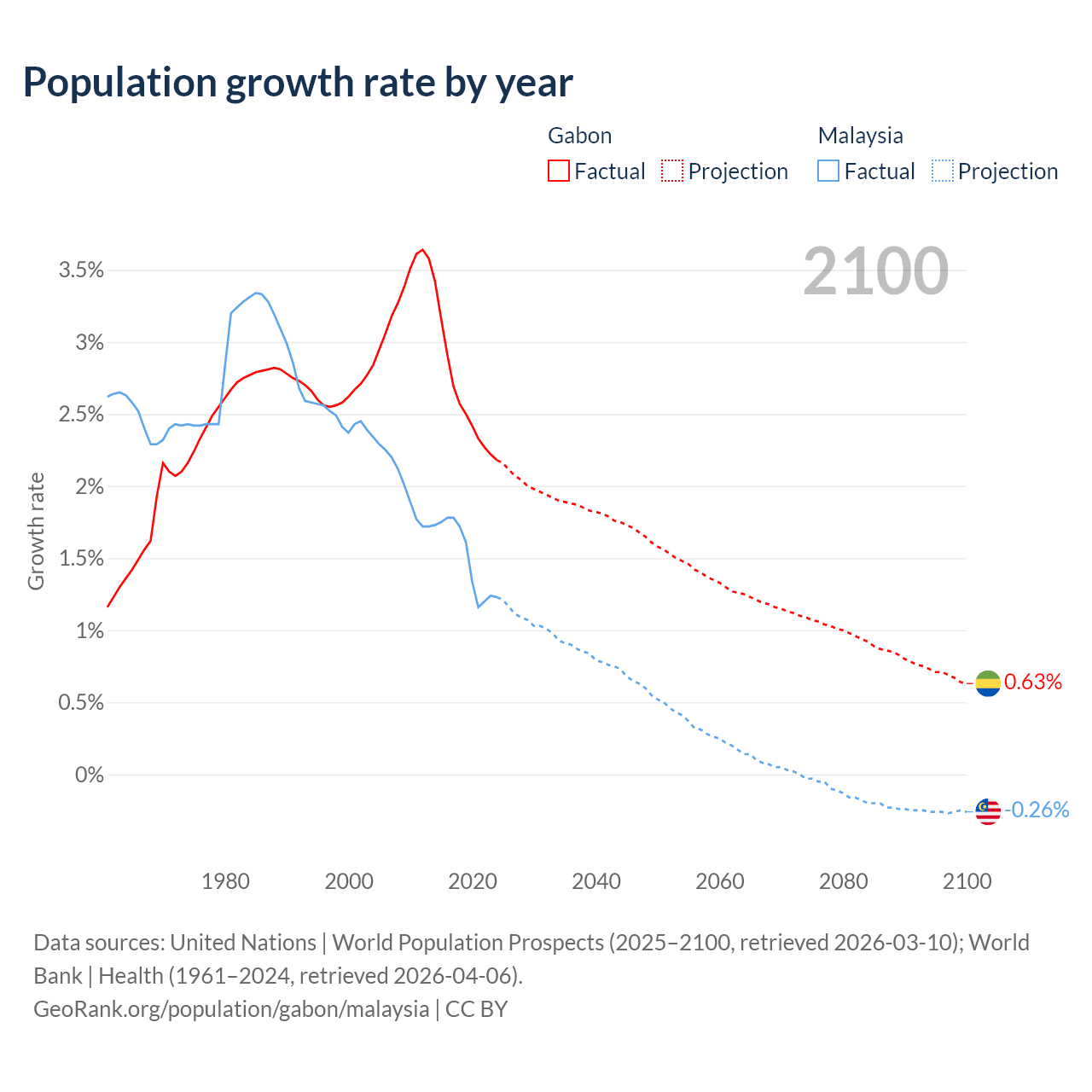 - For the last 10 years, Gabon has had an average growth rate of +2.61% per year vs +1.5% in Malaysia.