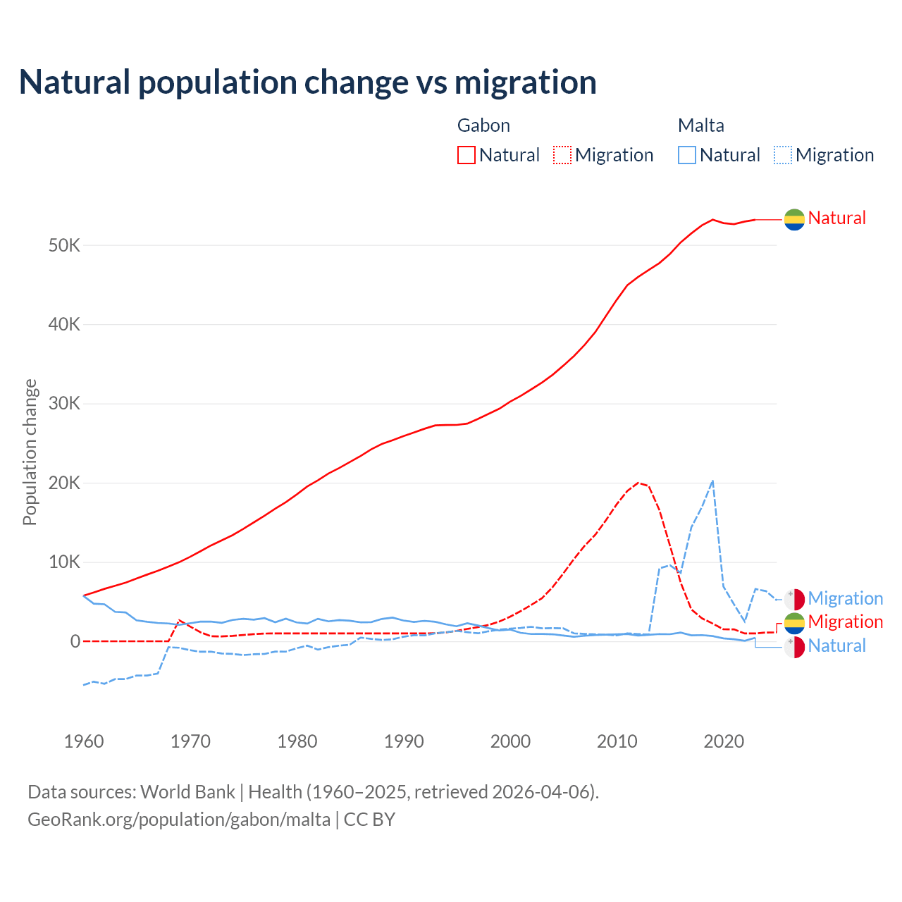 Over the last 10 years, 91.1% of the population change in Gabon is from natural causes (a gain of 515,484 people) and 8.86% is from migration (a gain of 50,119 people). In Malta 5.84% is from natural causes (a gain of 6,181 people) and 94.2% is from migration (a gain of 99,652 people).