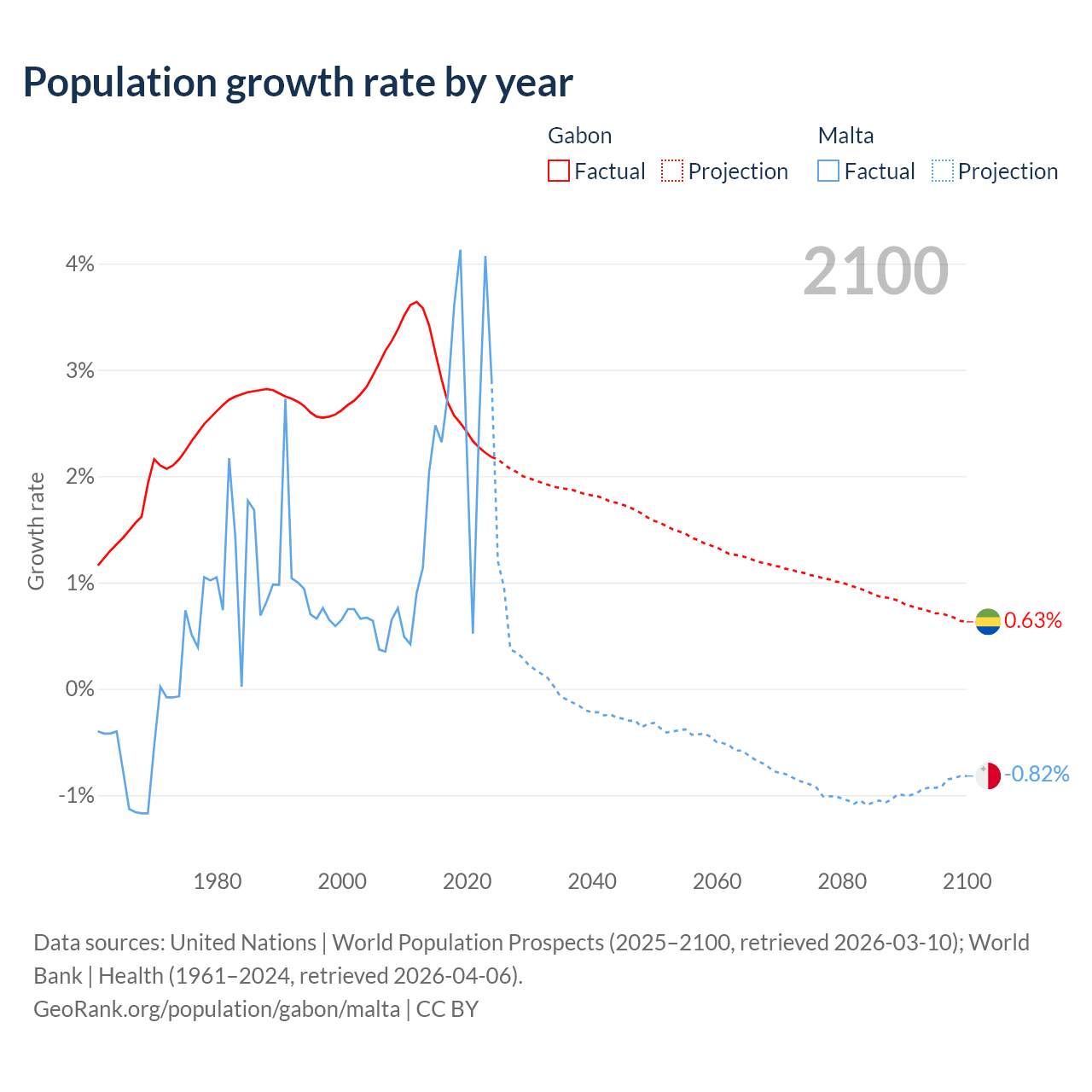 - For the last 10 years, Gabon has had an average growth rate of +2.61% per year vs +2.69% in Malta.