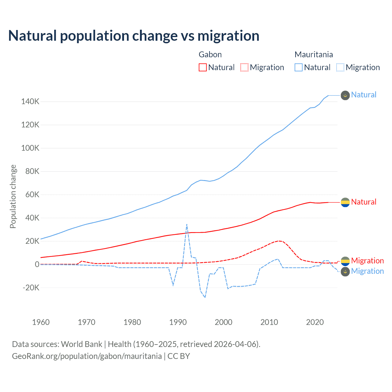Over the last 10 years, 91.1% of the population change in Gabon is from natural causes (a gain of 515,484 people) and 8.86% is from migration (a gain of 50,119 people). In Mauritania 98.9% is from natural causes (a gain of 1,320,903 people) and 1.12% is from migration (a loss of 14,982 people).