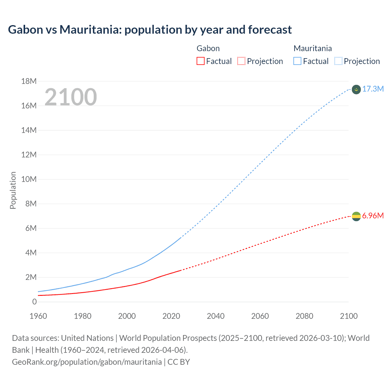The latest officially reported population of Gabon was 2,538,952 in 2024 vs 5,169,395 people in Mauritania in 2024. In 2026, based on the adjusted UN estimation, the current Gabon's population is 2,663,339 people compared to 5,505,206 in Mauritania.