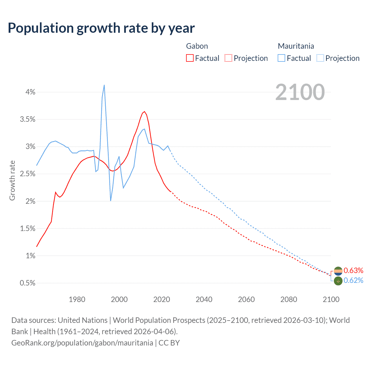 - For the last 10 years, Gabon has had an average growth rate of +2.61% per year vs +3% in Mauritania.