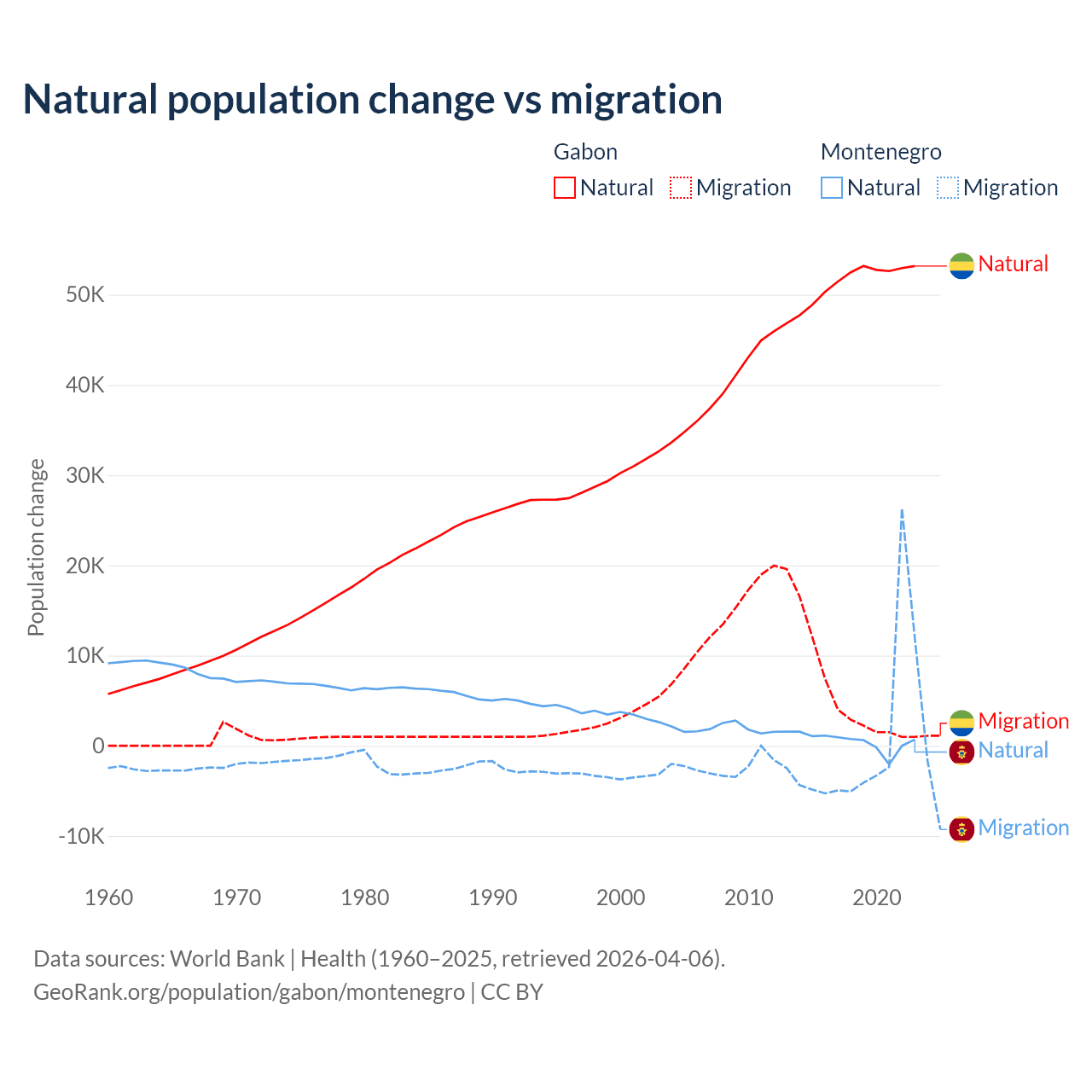 Over the last 10 years, 91.1% of the population change in Gabon is from natural causes (a gain of 515,484 people) and 8.86% is from migration (a gain of 50,119 people). In Montenegro 52.4% is from natural causes (a gain of 4,501 people) and 47.6% is from migration (a gain of 4,095 people).