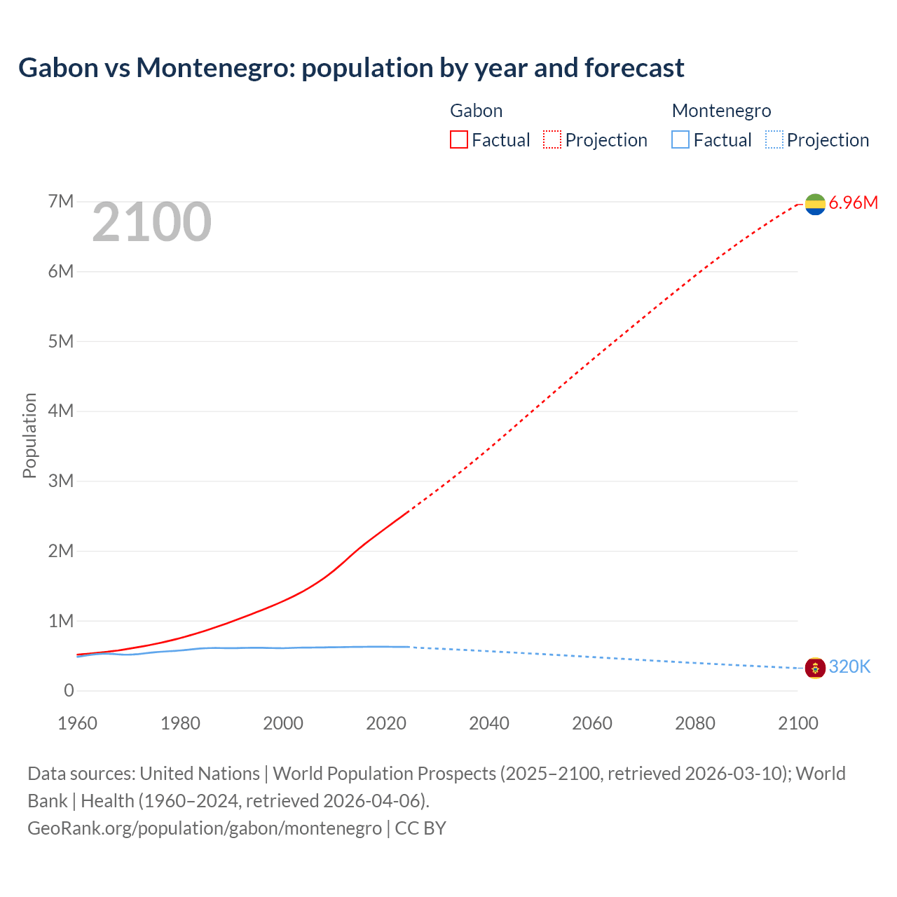 The latest officially reported population of Gabon was 2,538,952 in 2024 vs 623,525 people in Montenegro in 2024. In 2026, based on the adjusted UN estimation, the current Gabon's population is 2,663,339 people compared to 612,312 in Montenegro.
