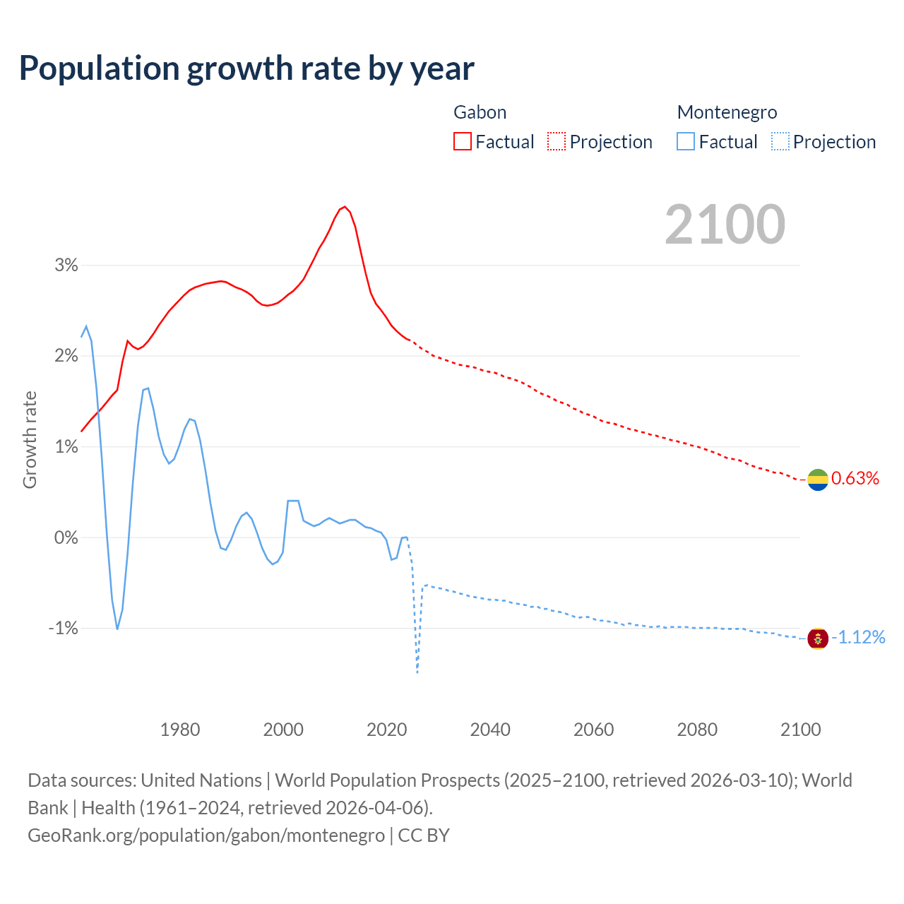 - For the last 10 years, Gabon has had an average growth rate of +2.61% per year vs +0.01% in Montenegro.