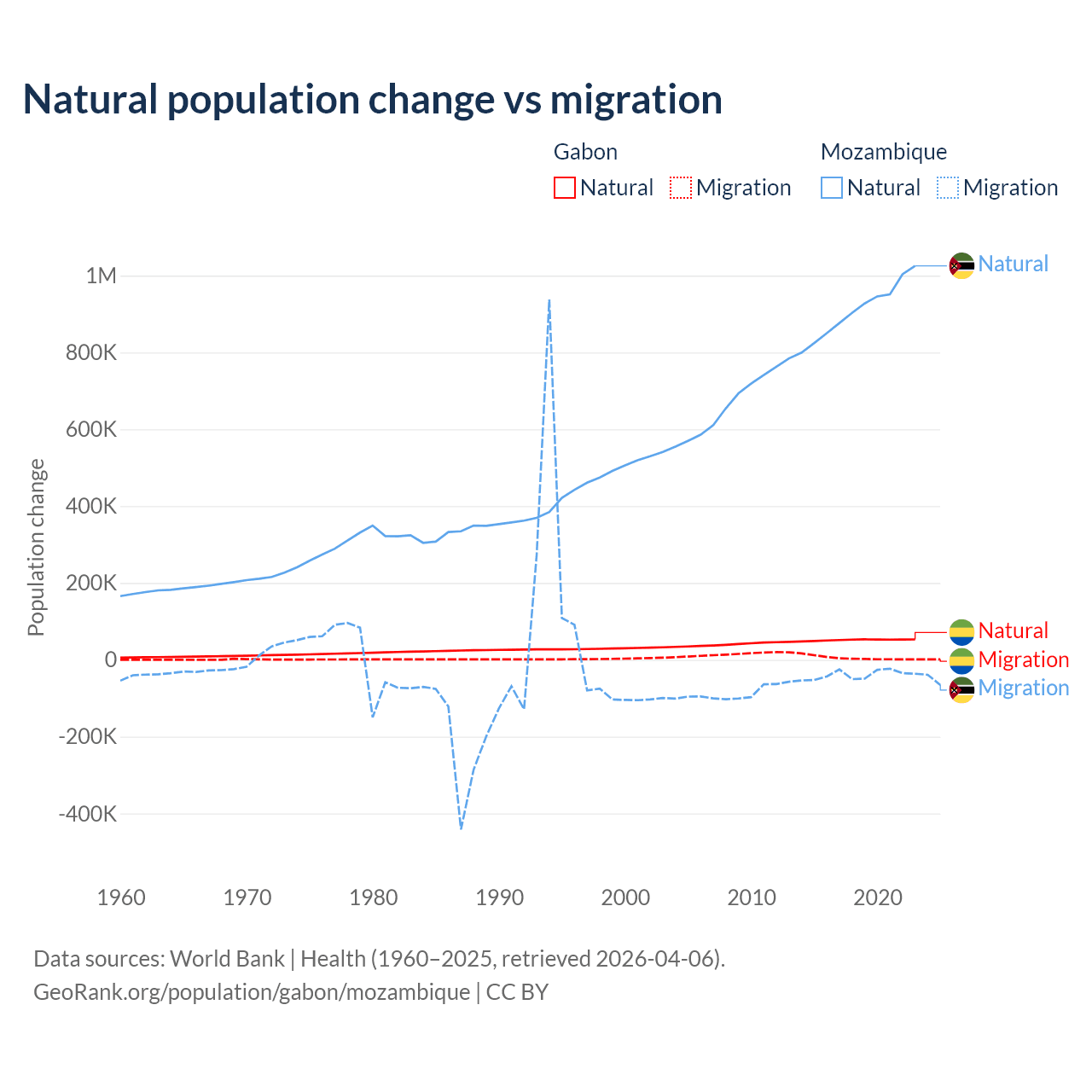 Over the last 10 years, 91.1% of the population change in Gabon is from natural causes (a gain of 515,484 people) and 8.86% is from migration (a gain of 50,119 people). In Mozambique 95.9% is from natural causes (a gain of 9,108,203 people) and 4.15% is from migration (a loss of 393,923 people).