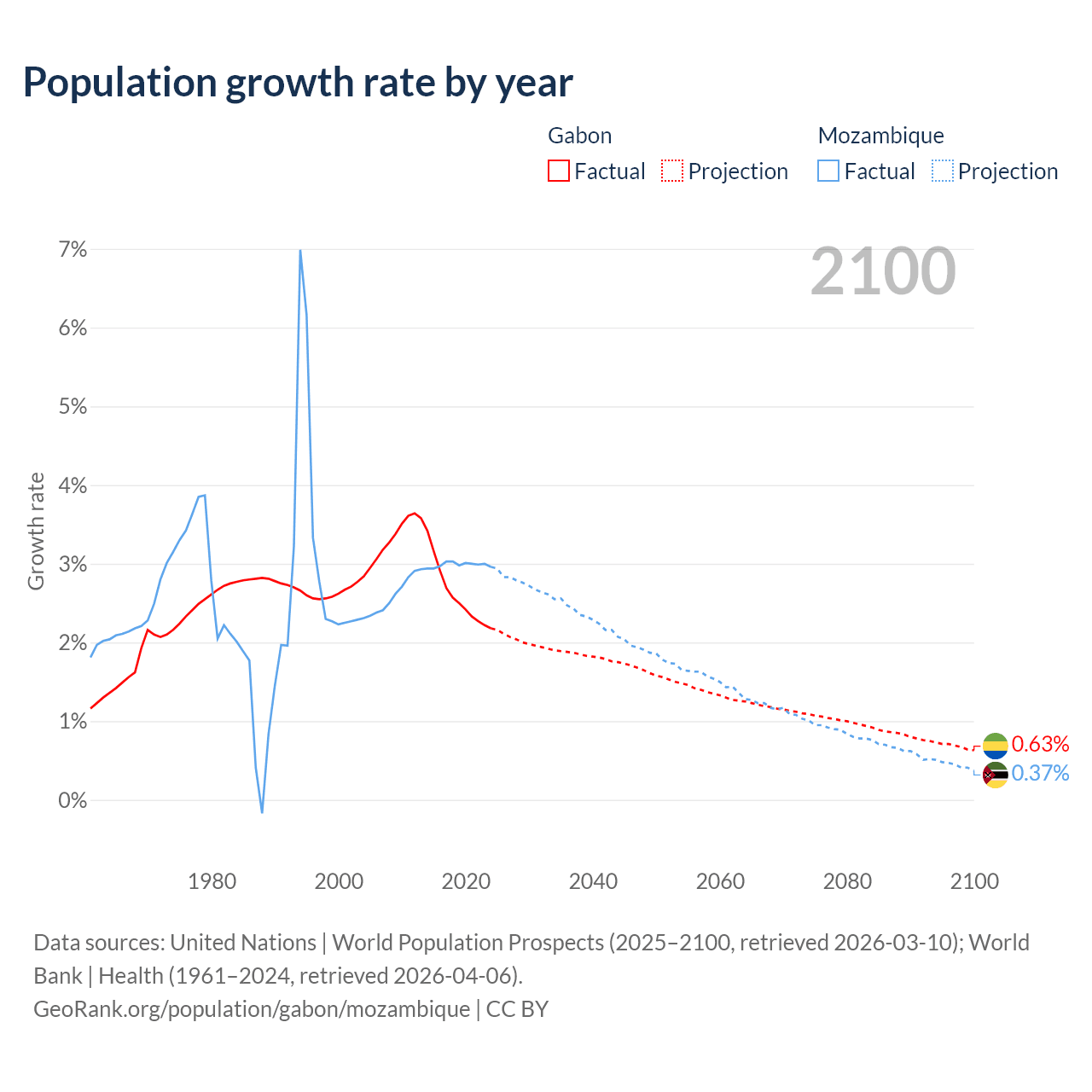 - For the last 10 years, Gabon has had an average growth rate of +2.61% per year vs +2.99% in Mozambique.