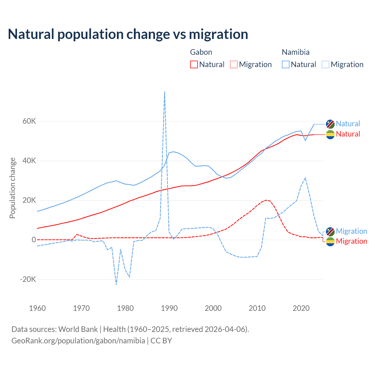 Over the last 10 years, 91.1% of the population change in Gabon is from natural causes (a gain of 515,484 people) and 8.86% is from migration (a gain of 50,119 people). In Namibia 74.3% is from natural causes (a gain of 532,532 people) and 25.7% is from migration (a gain of 183,837 people).