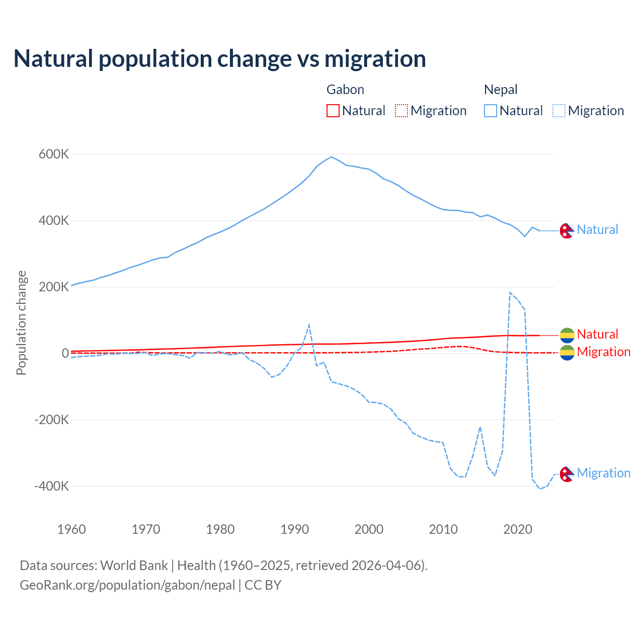 Over the last 10 years, 91.1% of the population change in Gabon is from natural causes (a gain of 515,484 people) and 8.86% is from migration (a gain of 50,119 people). In Nepal 67.9% is from natural causes (a gain of 3,909,749 people) and 32.1% is from migration (a loss of 1,851,664 people).