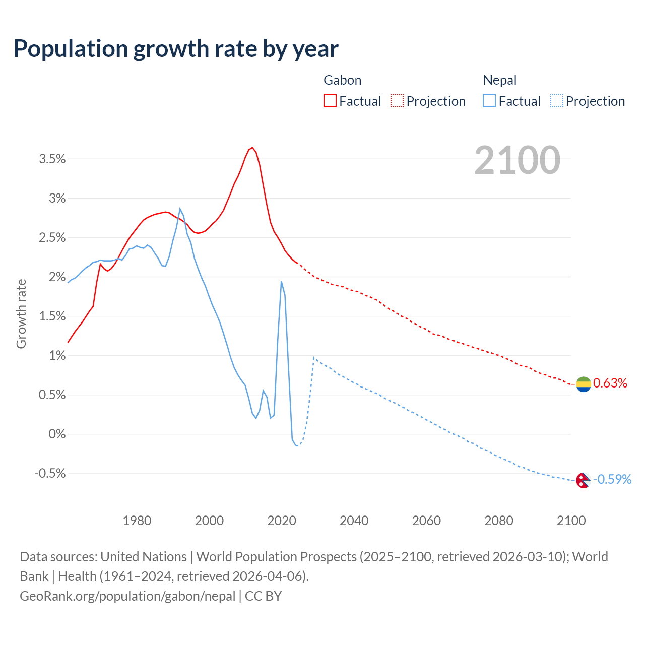 - For the last 10 years, Gabon has had an average growth rate of +2.61% per year vs +0.66% in Nepal.