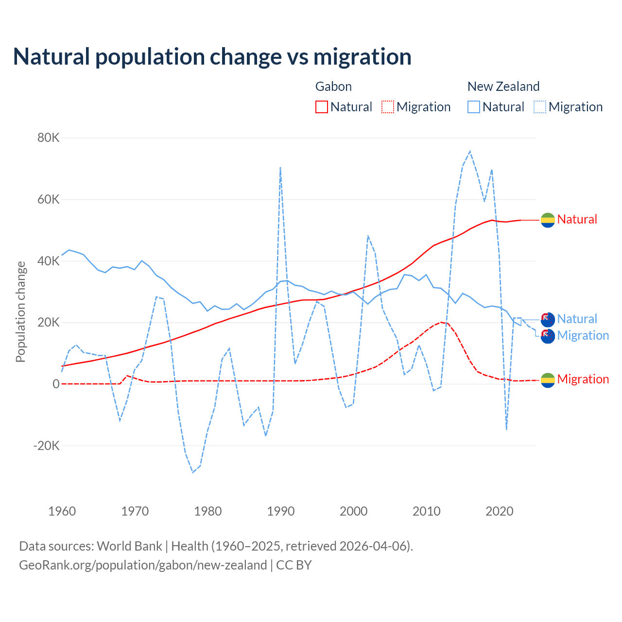 Over the last 10 years, 91.1% of the population change in Gabon is from natural causes (a gain of 515,484 people) and 8.86% is from migration (a gain of 50,119 people). In New Zealand 34.4% is from natural causes (a gain of 247,767 people) and 65.6% is from migration (a gain of 471,602 people).