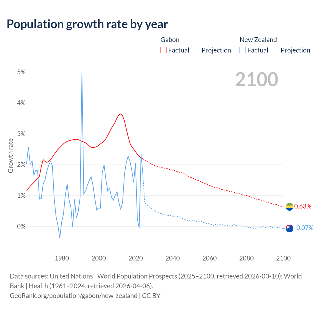 - For the last 10 years, Gabon has had an average growth rate of +2.61% per year vs +1.6% in New Zealand.