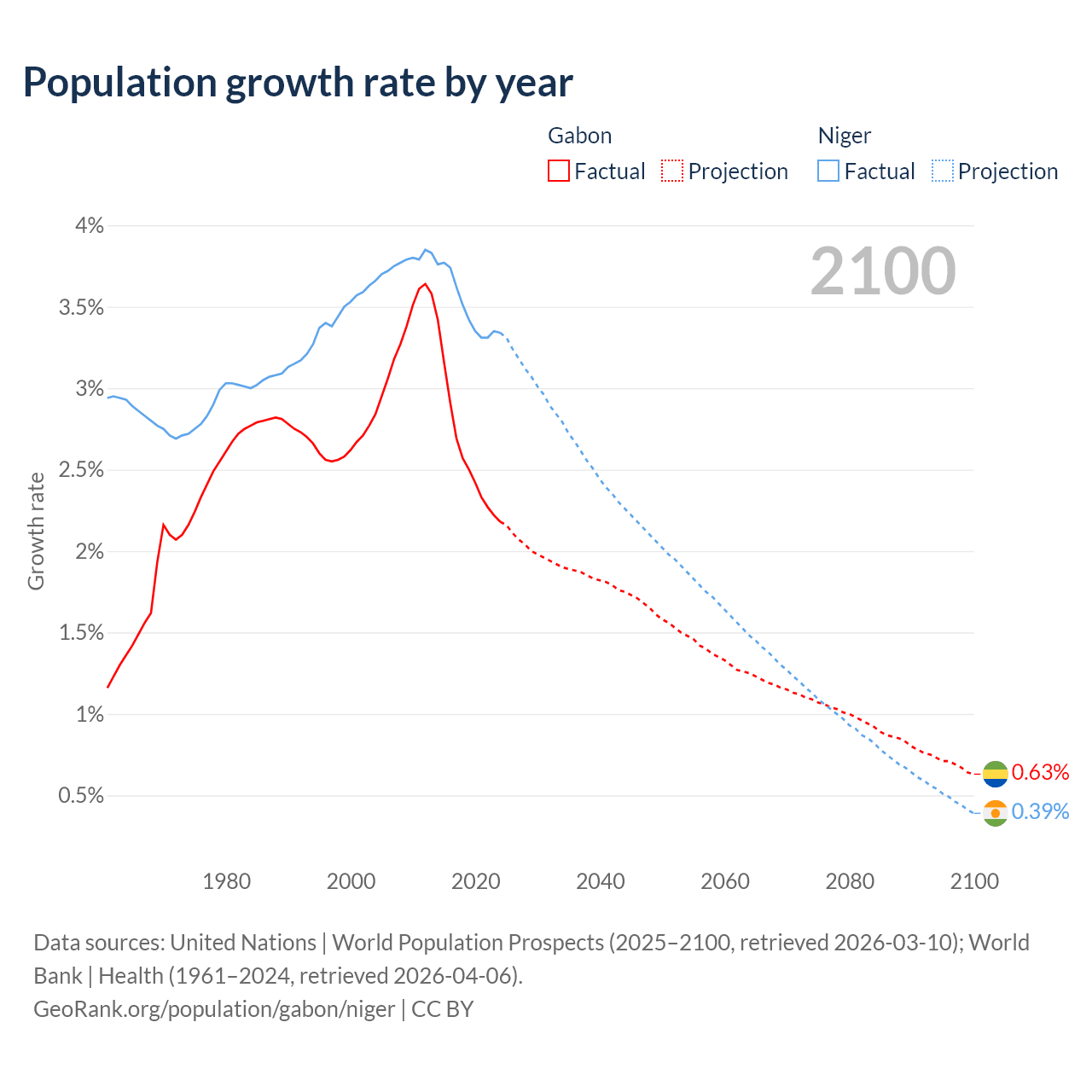- For the last 10 years, Gabon has had an average growth rate of +2.61% per year vs +3.5% in Niger.