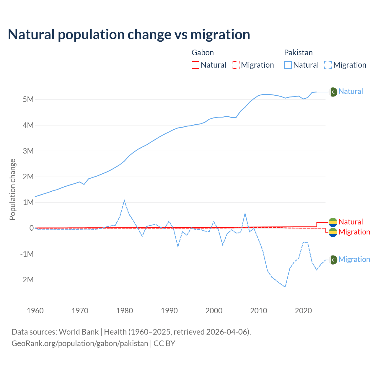 Over the last 10 years, 91.1% of the population change in Gabon is from natural causes (a gain of 515,484 people) and 8.86% is from migration (a gain of 50,119 people). In Pakistan 77.8% is from natural causes (a gain of 51,255,404 people) and 22.2% is from migration (a loss of 14,629,055 people).
