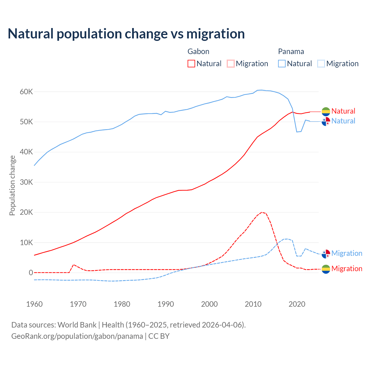 Over the last 10 years, 91.1% of the population change in Gabon is from natural causes (a gain of 515,484 people) and 8.86% is from migration (a gain of 50,119 people). In Panama 86.5% is from natural causes (a gain of 544,211 people) and 13.5% is from migration (a gain of 84,849 people).
