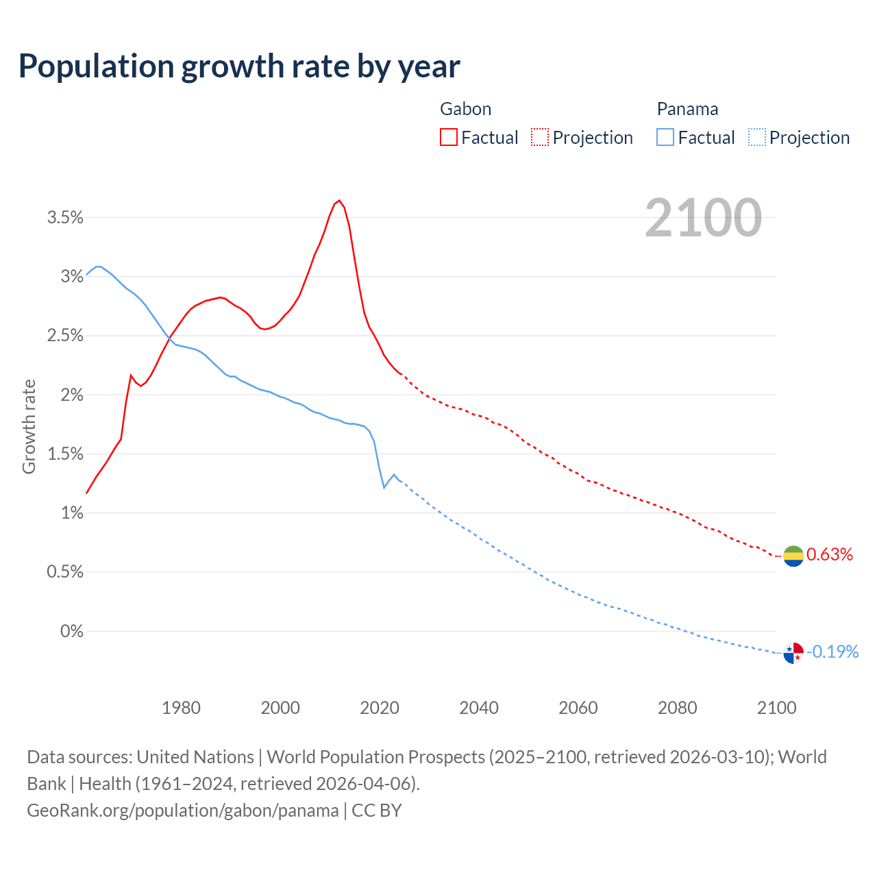 - For the last 10 years, Gabon has had an average growth rate of +2.61% per year vs +1.52% in Panama.