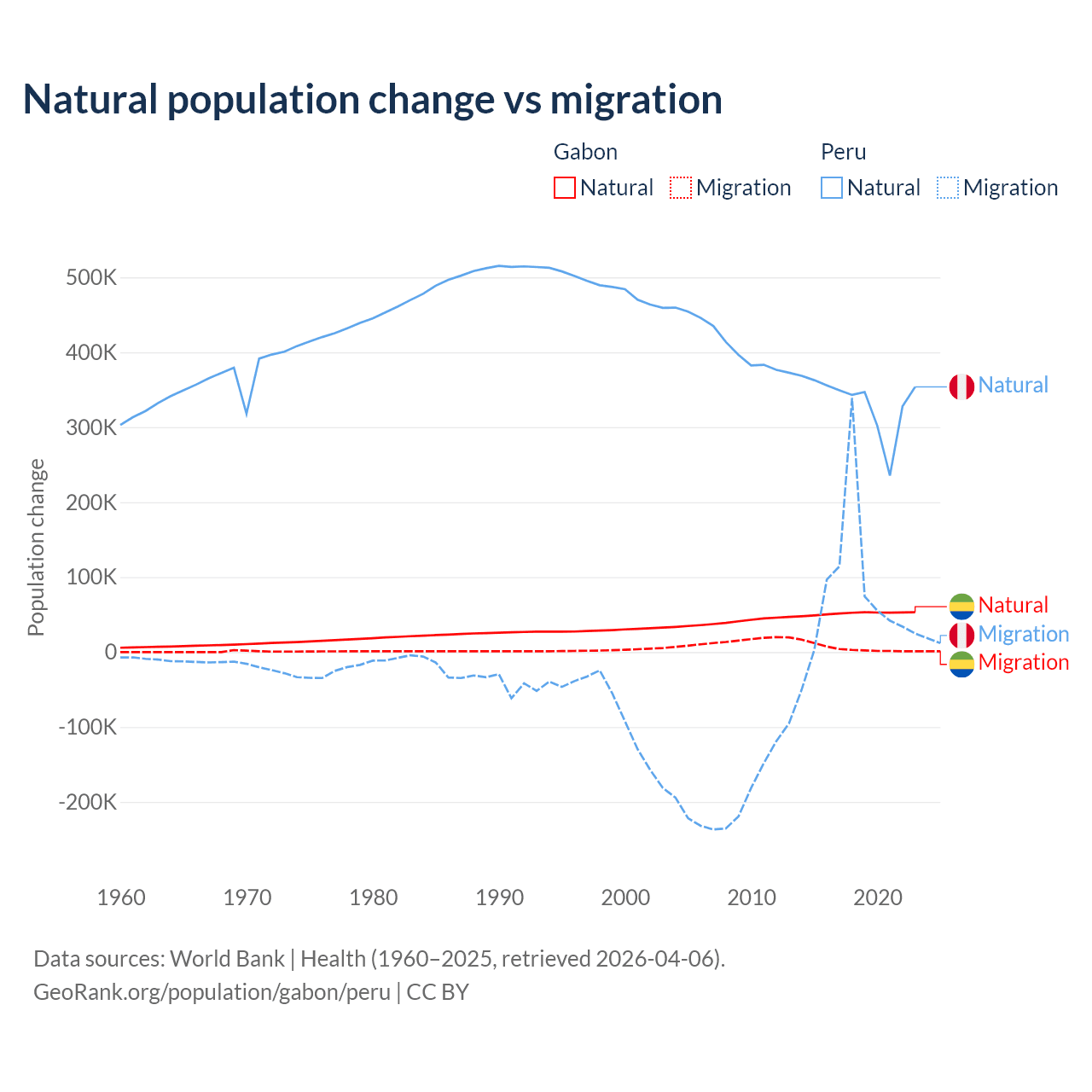 Over the last 10 years, 91.1% of the population change in Gabon is from natural causes (a gain of 515,484 people) and 8.86% is from migration (a gain of 50,119 people). In Peru 82% is from natural causes (a gain of 3,345,822 people) and 18% is from migration (a gain of 732,505 people).
