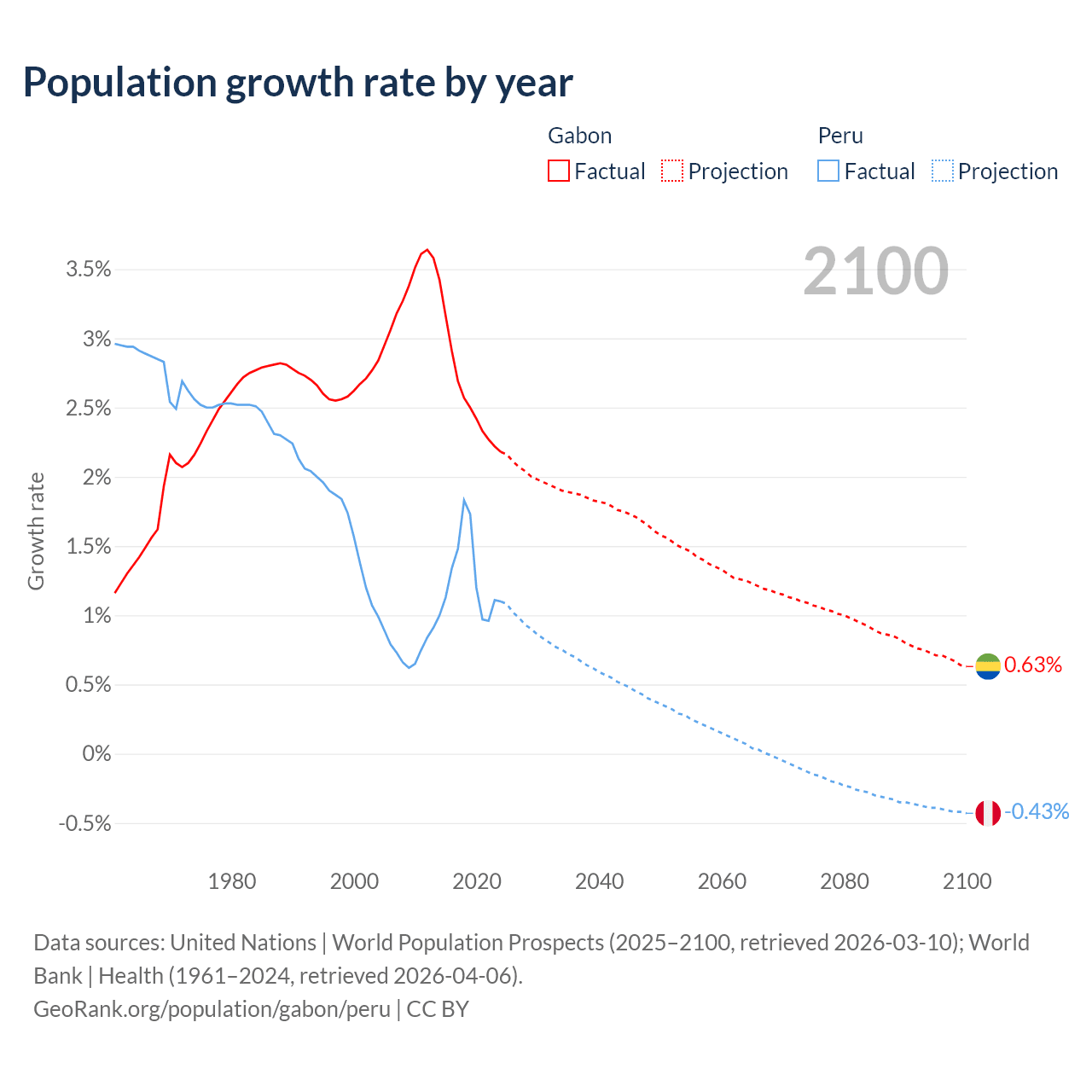 - For the last 10 years, Gabon has had an average growth rate of +2.61% per year vs +1.26% in Peru.