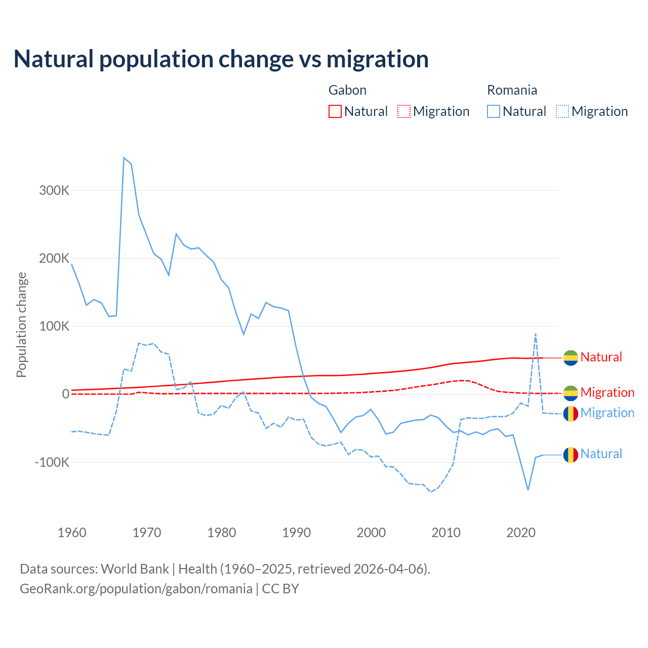 Over the last 10 years, 91.1% of the population change in Gabon is from natural causes (a gain of 515,484 people) and 8.86% is from migration (a gain of 50,119 people). In Romania 82% is from natural causes (a loss of 766,295 people) and 18% is from migration (a loss of 167,917 people).