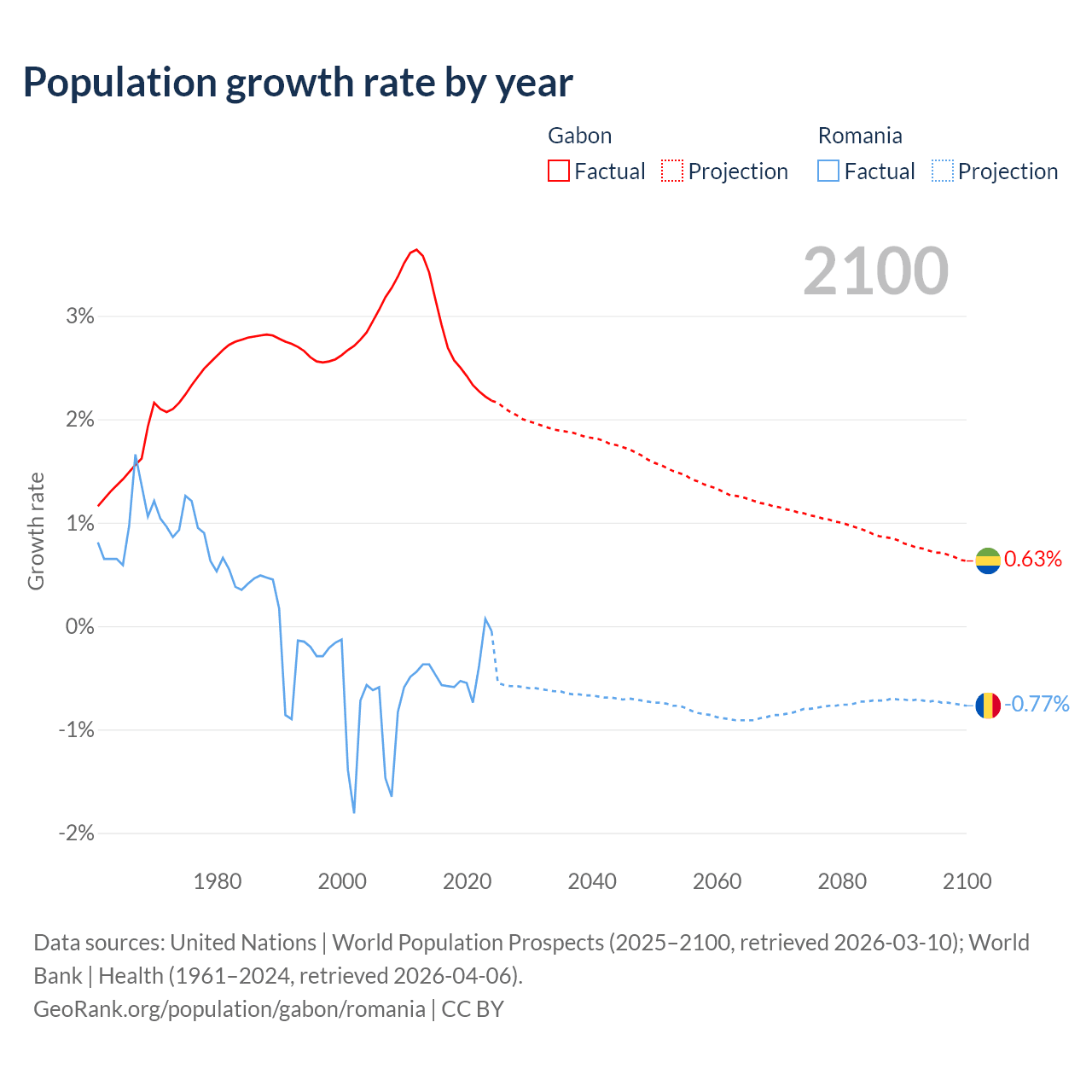 - For the last 10 years, Gabon has had an average growth rate of +2.61% per year vs -0.43% in Romania.