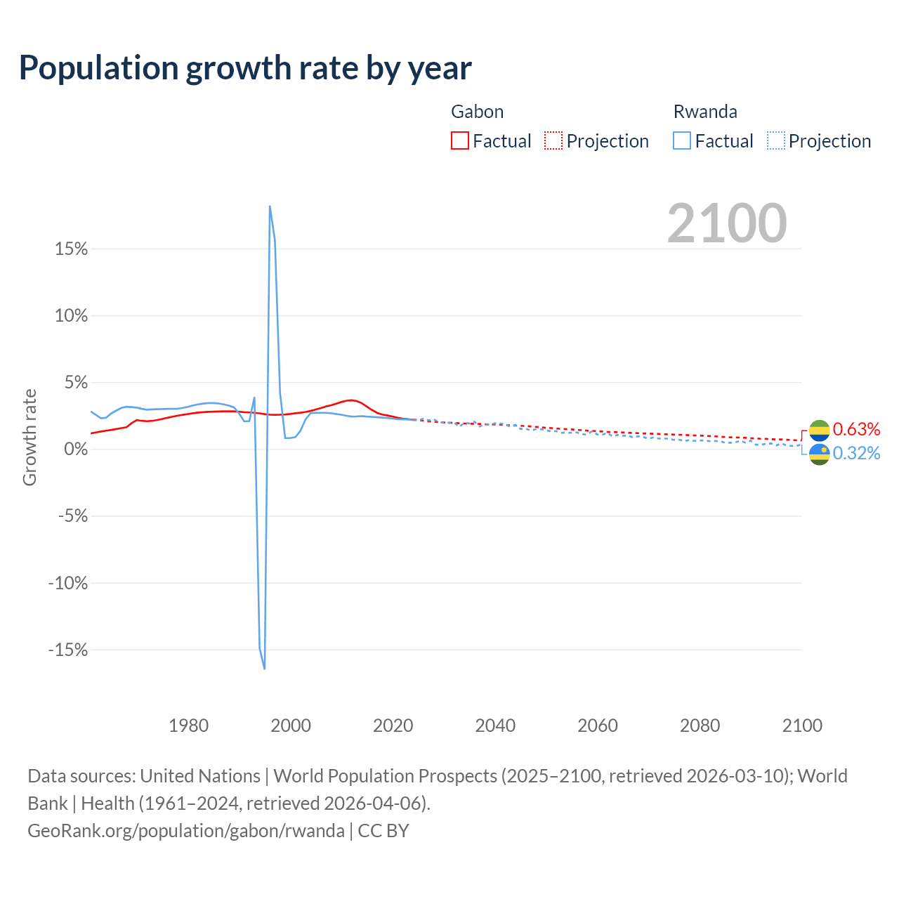 - For the last 10 years, Gabon has had an average growth rate of +2.61% per year vs +2.31% in Rwanda.