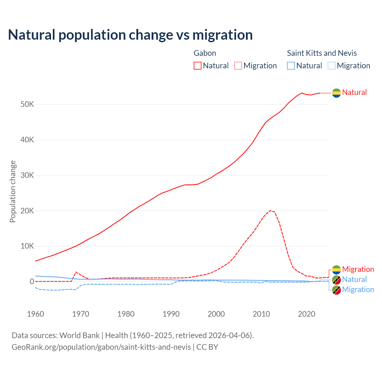 Over the last 10 years, 91.1% of the population change in Gabon is from natural causes (a gain of 515,484 people) and 8.86% is from migration (a gain of 50,119 people). In Saint Kitts and Nevis 44.9% is from natural causes (a gain of 1,225 people) and 55.1% is from migration (a loss of 1,506 people).