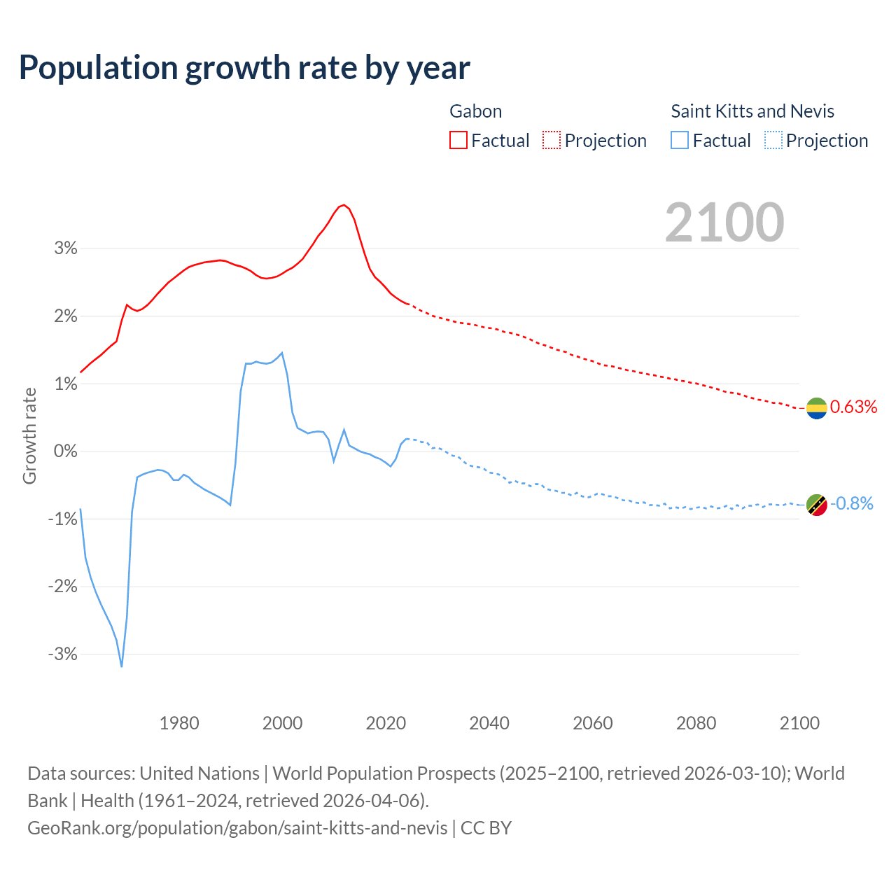 Gabon vs Saint Kitts and Nevis: population by year and forecast
