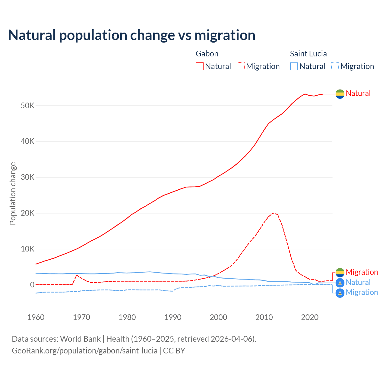 Over the last 10 years, 91.1% of the population change in Gabon is from natural causes (a gain of 515,484 people) and 8.86% is from migration (a gain of 50,119 people). In Saint Lucia 95.7% is from natural causes (a gain of 6,039 people) and 4.31% is from migration (a loss of 272 people).