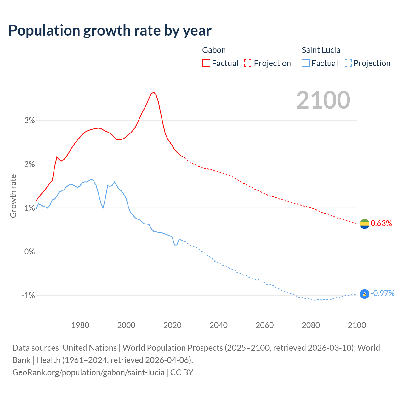 - For the last 10 years, Gabon has had an average growth rate of +2.61% per year vs +0.33% in Saint Lucia.