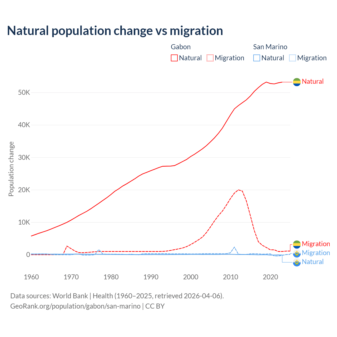 Over the last 10 years, 91.1% of the population change in Gabon is from natural causes (a gain of 515,484 people) and 8.86% is from migration (a gain of 50,119 people). In San Marino 40.9% is from natural causes (a loss of 358 people) and 59.1% is from migration (a gain of 517 people).
