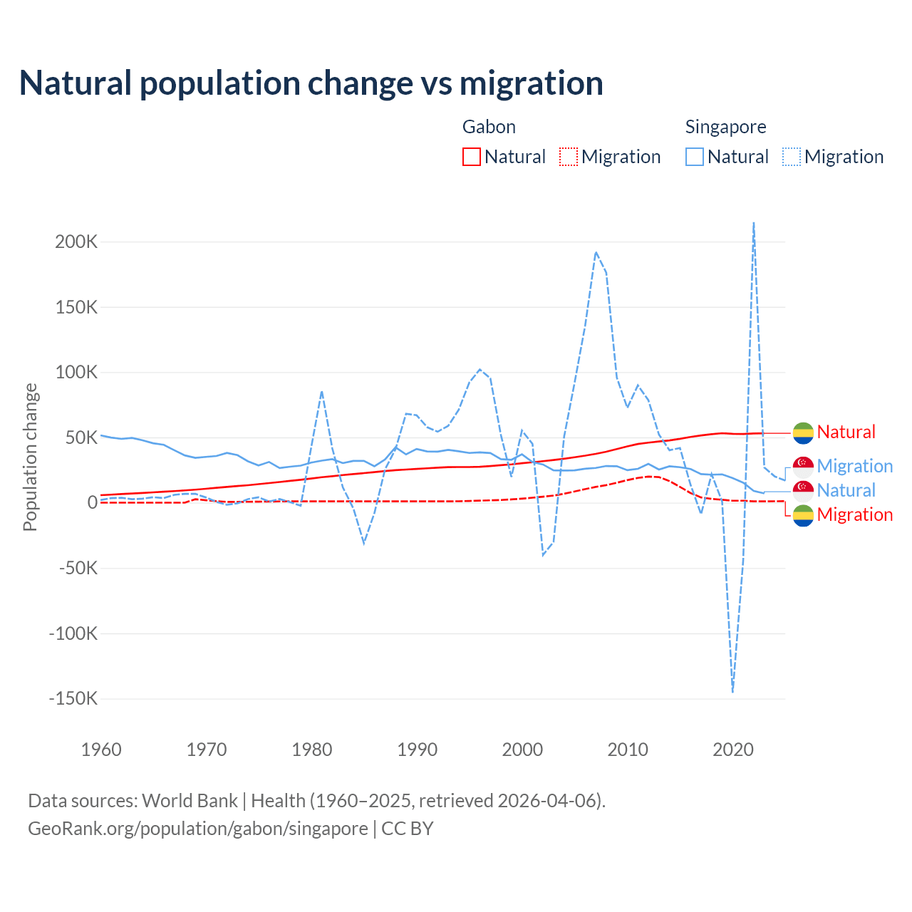 Over the last 10 years, 91.1% of the population change in Gabon is from natural causes (a gain of 515,484 people) and 8.86% is from migration (a gain of 50,119 people). In Singapore 54.8% is from natural causes (a gain of 195,953 people) and 45.2% is from migration (a gain of 161,805 people).