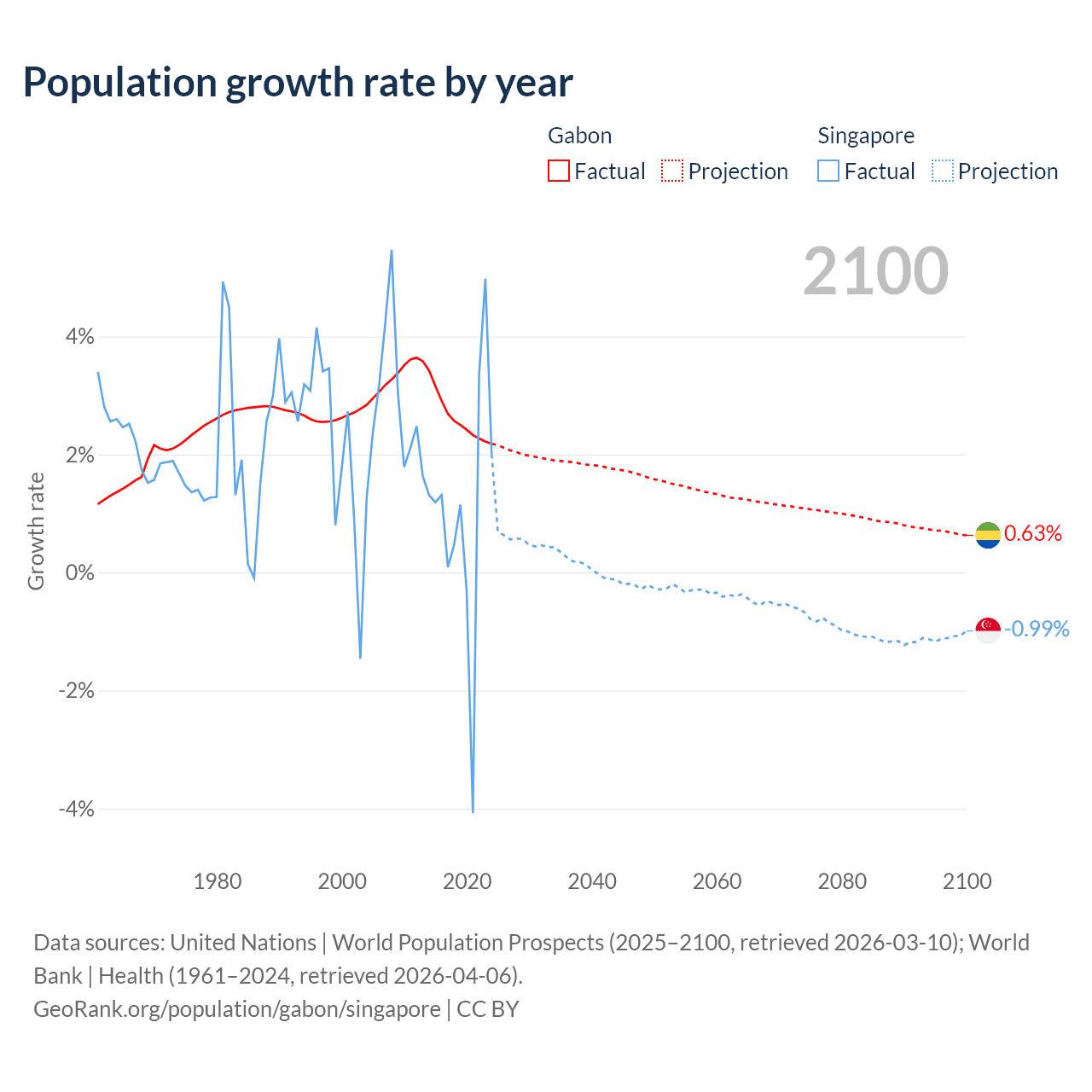 - For the last 10 years, Gabon has had an average growth rate of +2.61% per year vs +1.04% in Singapore.