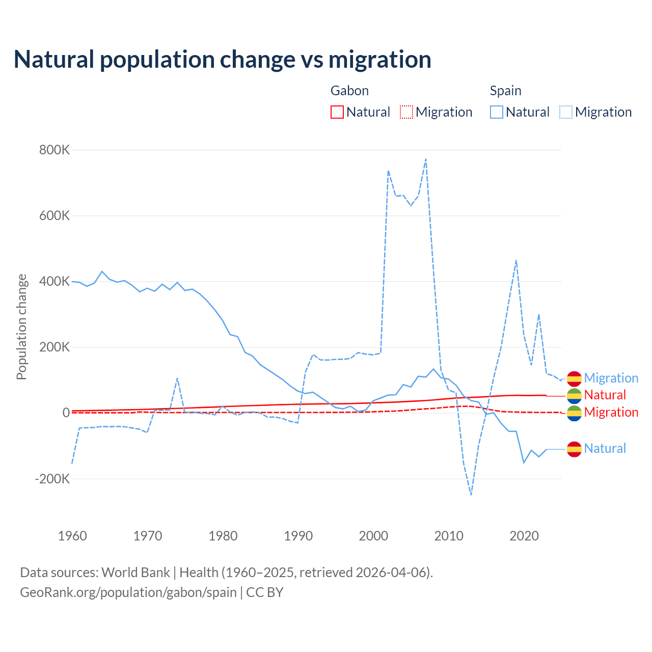 Over the last 10 years, 91.1% of the population change in Gabon is from natural causes (a gain of 515,484 people) and 8.86% is from migration (a gain of 50,119 people). In Spain 25.8% is from natural causes (a loss of 627,829 people) and 74.2% is from migration (a gain of 1,810,127 people).