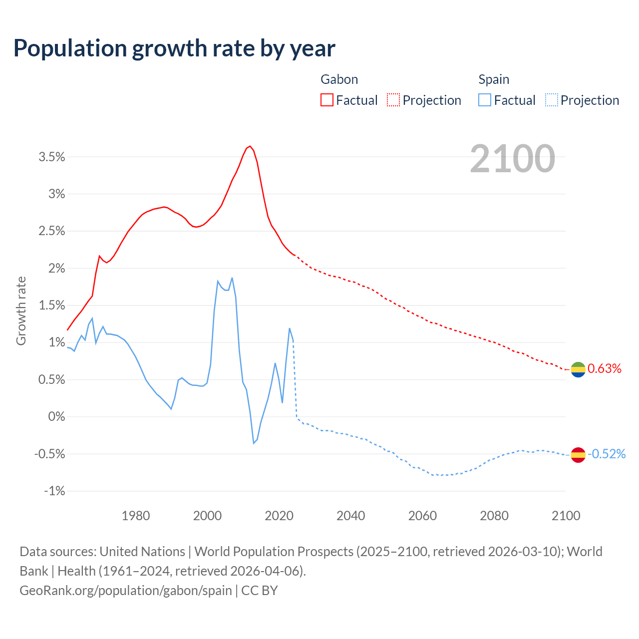 - For the last 10 years, Gabon has had an average growth rate of +2.61% per year vs +0.43% in Spain.