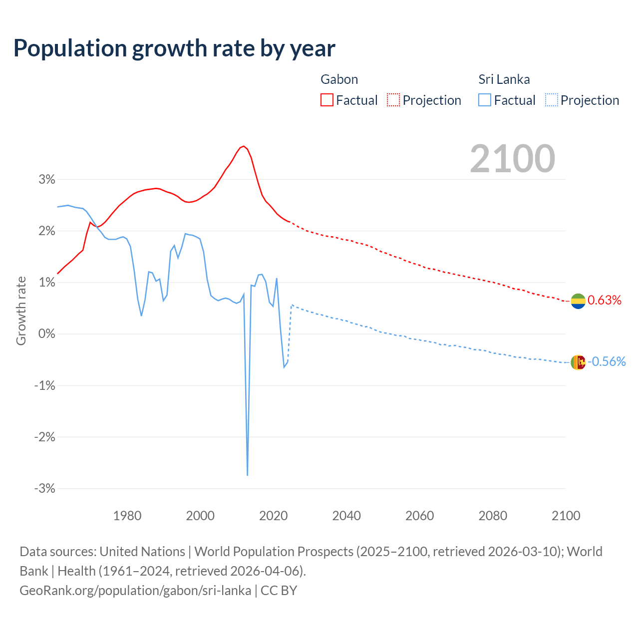 - For the last 10 years, Gabon has had an average growth rate of +2.61% per year vs +0.57% in Sri Lanka.