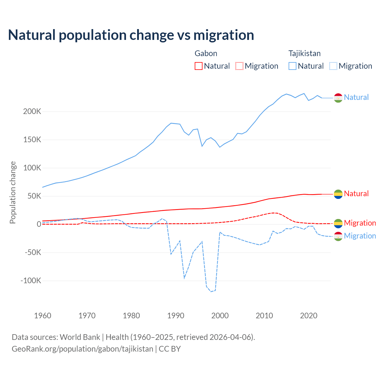 Over the last 10 years, 91.1% of the population change in Gabon is from natural causes (a gain of 515,484 people) and 8.86% is from migration (a gain of 50,119 people). In Tajikistan 96% is from natural causes (a gain of 2,266,045 people) and 3.95% is from migration (a loss of 93,205 people).