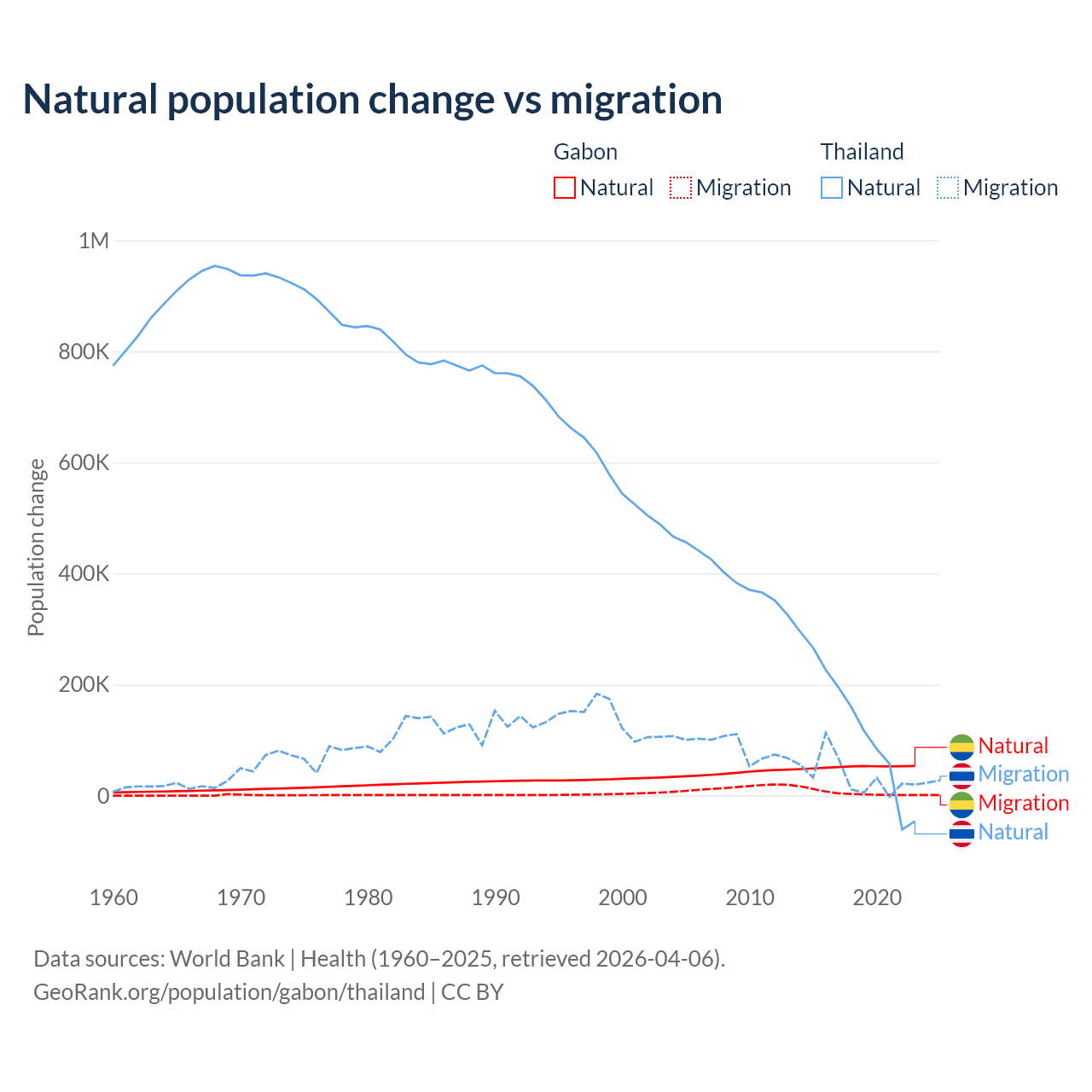 Over the last 10 years, 91.1% of the population change in Gabon is from natural causes (a gain of 515,484 people) and 8.86% is from migration (a gain of 50,119 people). In Thailand 78.4% is from natural causes (a gain of 1,292,528 people) and 21.6% is from migration (a gain of 355,361 people).