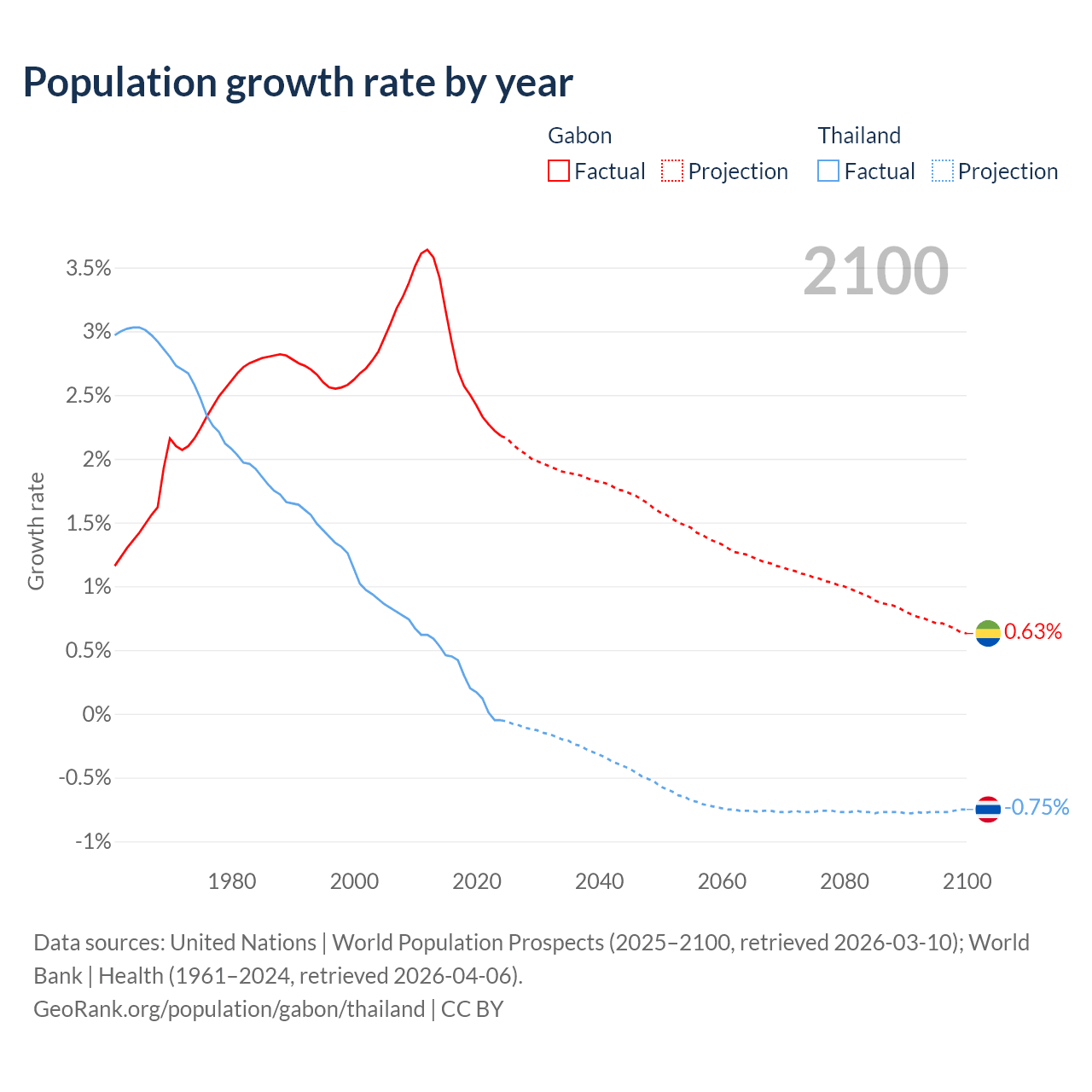 - For the last 10 years, Gabon has had an average growth rate of +2.61% per year vs +0.23% in Thailand.