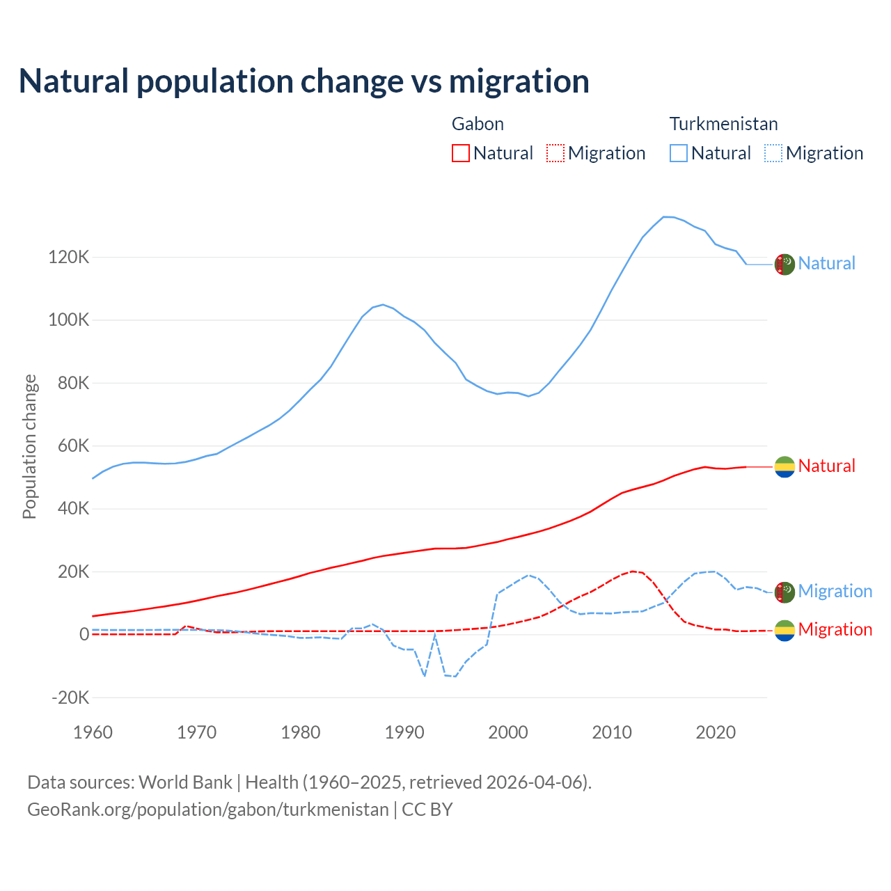 Over the last 10 years, 91.1% of the population change in Gabon is from natural causes (a gain of 515,484 people) and 8.86% is from migration (a gain of 50,119 people). In Turkmenistan 89.2% is from natural causes (a gain of 1,270,228 people) and 10.8% is from migration (a gain of 154,379 people).