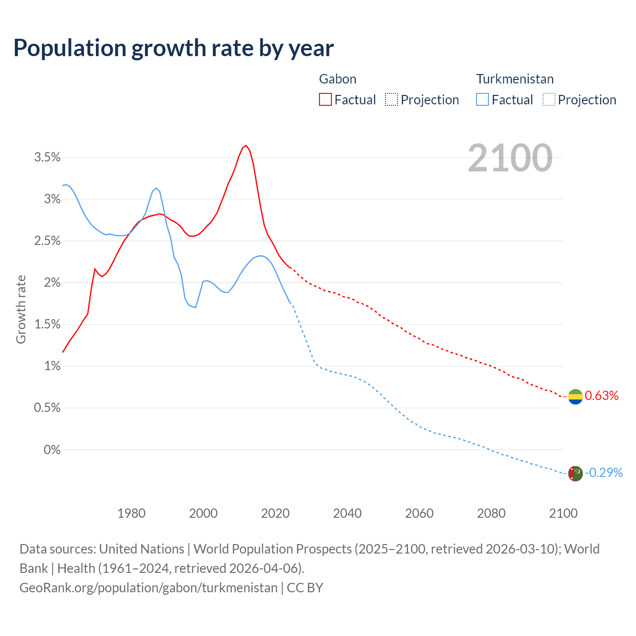 - For the last 10 years, Gabon has had an average growth rate of +2.61% per year vs +2.14% in Turkmenistan.