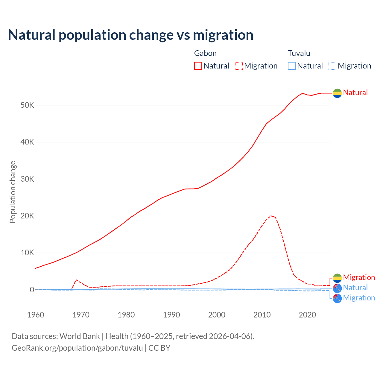 Over the last 10 years, 91.1% of the population change in Gabon is from natural causes (a gain of 515,484 people) and 8.86% is from migration (a gain of 50,119 people). In Tuvalu 35.5% is from natural causes (a gain of 1,556 people) and 64.5% is from migration (a loss of 2,827 people).